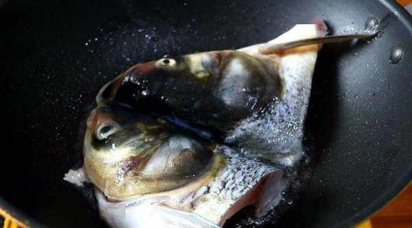 3、 鍋中倒入適量油,油熱後把魚頭下入鍋中煎制一下,加一些薑蒜、剁椒、料酒、老抽,再倒入適量清水燜煮。
