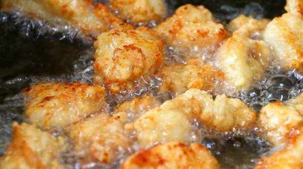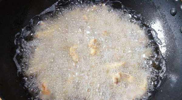 3、 鍋中倒入適量油,油熱後把肉條下入鍋中,炸到表面金黃撈出,接著再倒入鍋中復炸一次,口感更佳。