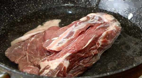 1、 把牛腱子橫著對半切開,放入鍋中焯一下水,變色後撈出瀝幹水分。