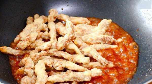4、 鍋中留少許底油,倒入番茄醬、白糖和生抽翻炒,加入少許清水,水開後淋入少許水淀粉,熬制濃稠後加一點醋,再把肉條倒入鍋中一起翻炒,等到表面均勻的裹上醬汁,撒一點白芝麻即可出鍋。