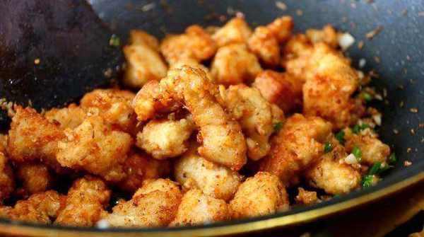 5、 鍋中留少許底油,先放油,蒜末、辣椒面和孜然粒下入鍋中炒出香味,再把炸好的雞塊倒進去一起翻炒,加一些蔥末和燒烤料炒勻即可。