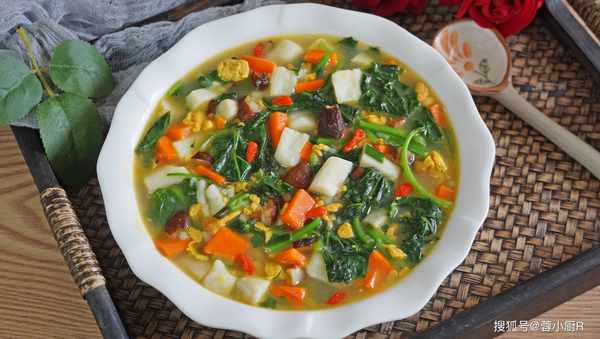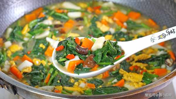 食材清單:幹香菇、山藥、胡蘿卜、紅薯葉、青菜、枸杞、蔥花、大蒜