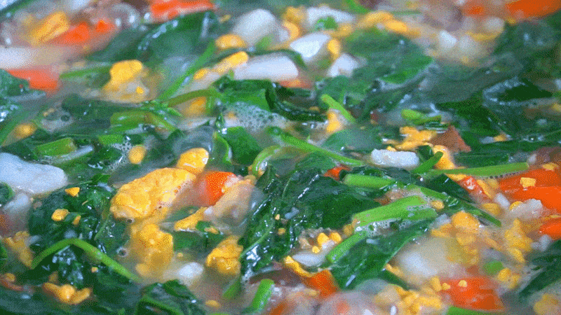 4、山藥和胡蘿卜煮熟後再倒入雞蛋和青菜,繼續煮一分鐘就可以關火瞭。
