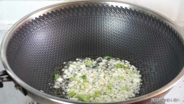 1、起鍋熱油,下蒜末和蔥白爆香,接著把香菇倒進來炒一炒。