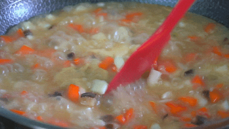 3、大火煮開後倒入山藥,胡蘿卜,調味加鹽、雞精、生抽、一點點蠔油,然後蓋上繼續煮5分鐘。
