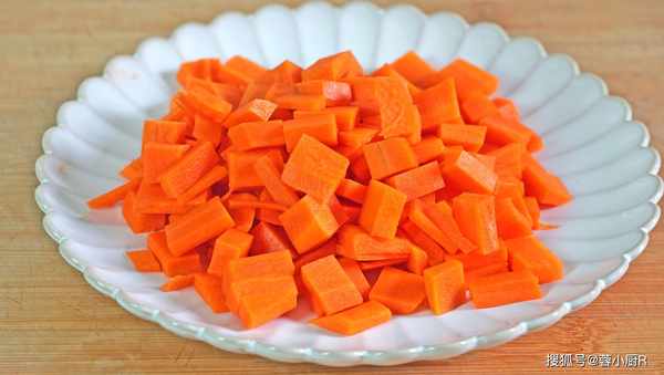 2、胡蘿卜一根,洗凈去皮後切厚片,再切成小丁備用。