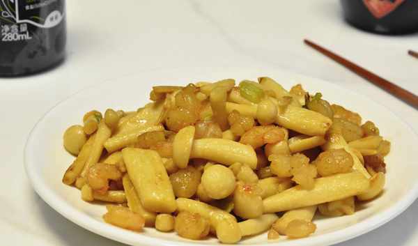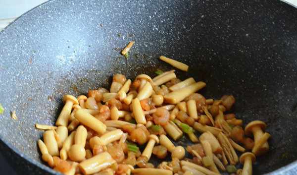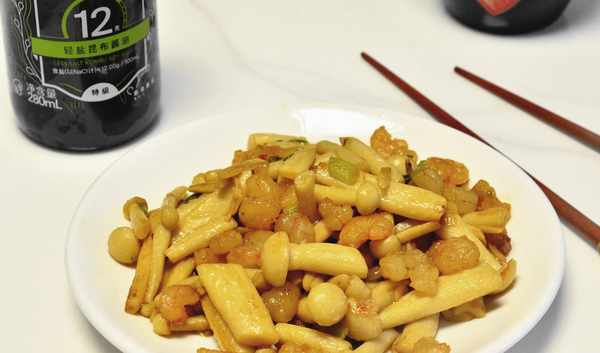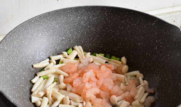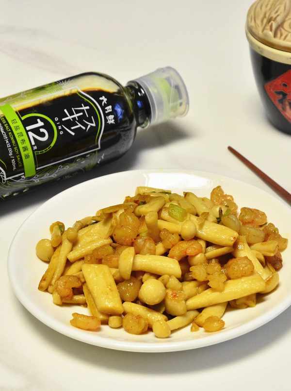 【食材】:蝦仁150克海鮮菇250克,六月鮮輕鹽醬油一勺,蠔油半勺蔥花適量