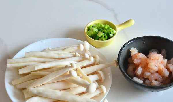 ①首先將海鮮菇清洗幹凈,蝦仁切丁,備好蔥花