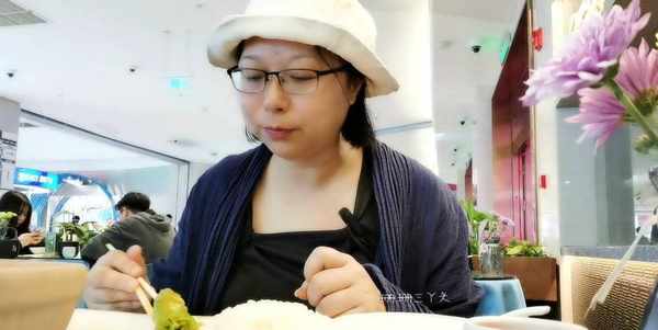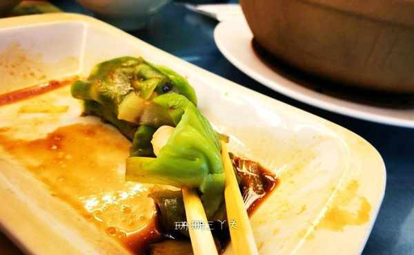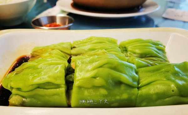 看完蝦餃制作,珊珊三丫頭把目光轉向較遠處,看師傅制作腸粉,因為比較遠,又隔著玻璃,沒有拍出清晰的照片,但整個過程我都看清楚瞭,綠色腸粉是用抽屜式腸粉制作方法,先把調成綠色的米漿澆在蒸制的抽屜盤子上,然後放上餡料,再放進櫃內隔水蒸一會,取出後卷成豬腸形狀,最後放在盤子上,再放入調味。我後來瞭解瞭一下,粉漿綠色,是因為在裡面添加瞭蔬菜汁。