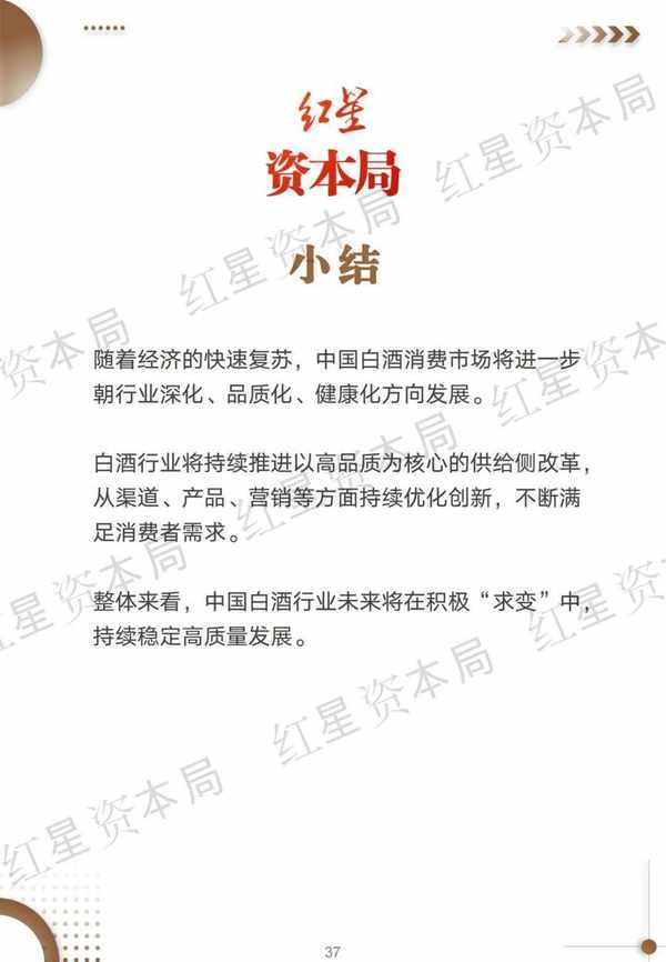隨著經濟的快速復蘇,中國白酒消費市場將進一步朝行業深化、品質化、健康化方向發展。白酒行業將持續推進以高品質為核心的供給側改革,從渠道、產品、營銷等方面持續優化創新,不斷滿足消費者需求。整體來看,中國白酒行業未來將在積極“求變”中,持續穩定高質量發展。