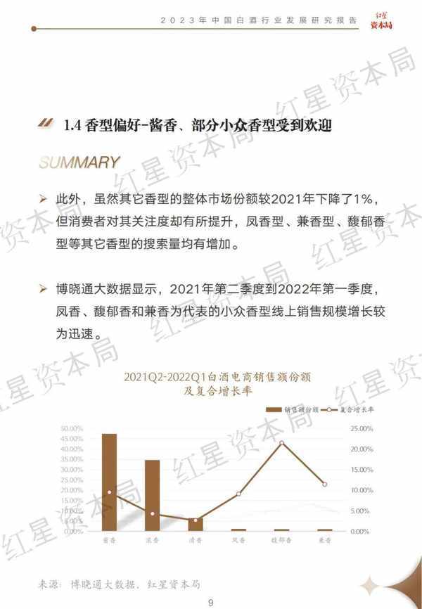 目前濃香型白酒仍是白酒行業規模最大的香型;但在“茅臺熱”等因素帶動下,醬香白酒發展迅速,不斷擠壓濃香白酒市場空間;此外,以鳳香、馥鬱香和兼香為代表的小眾香型在線上銷售規模增長較為迅速。