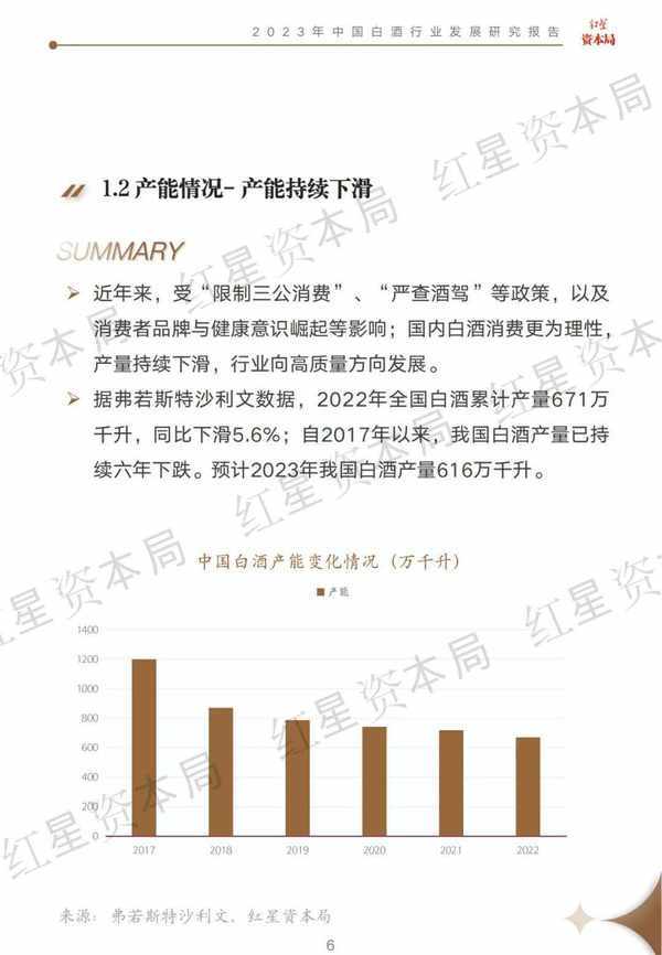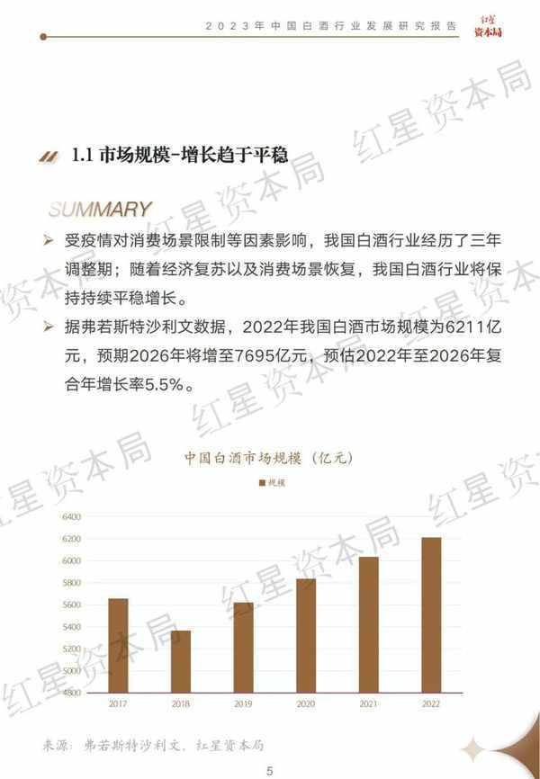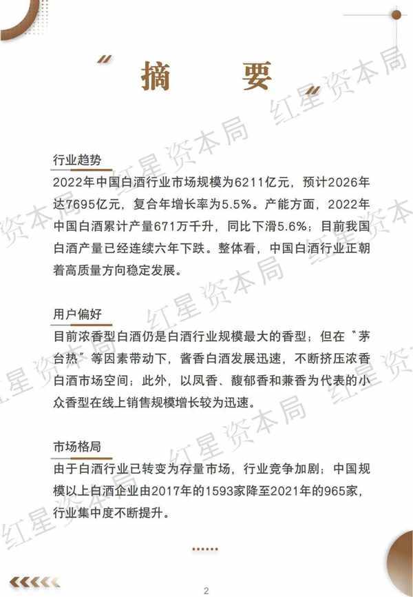 2022年中國白酒行業市場規模為6211億元,預計2026年達7695億元,復合年增長率為5.5%。產能方面,2022年中國白酒累計產量671萬千升,同比下滑5.6%;目前我國白酒產量已經連續六年下跌。整體看,中國白酒行業正朝著高質量方向穩定發展。