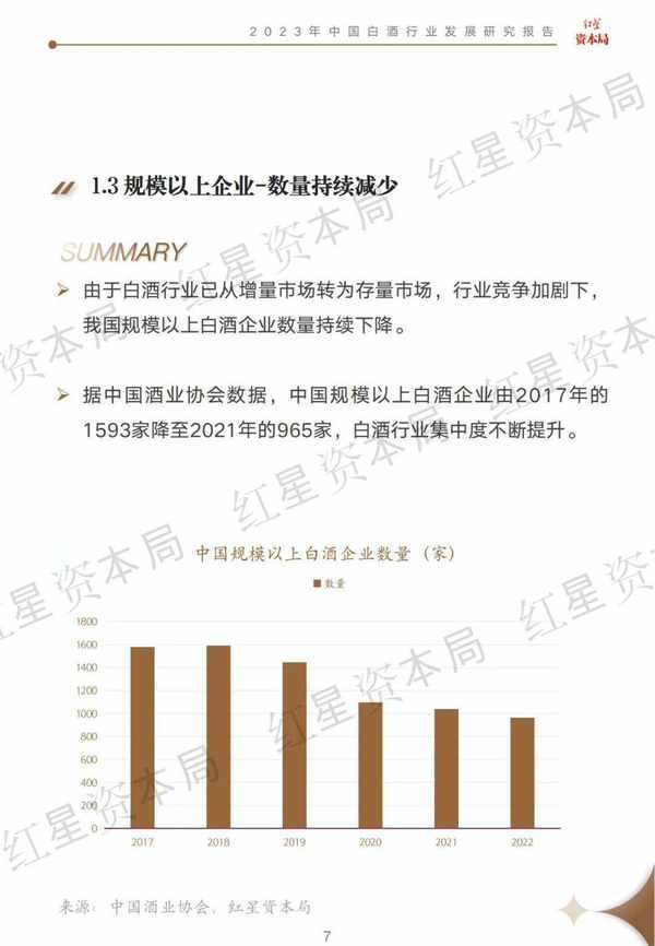 由於白酒行業已轉變為存量市場,行業競爭加劇。中國規模以上白酒企業由2017年的1593傢降至2021年的965傢,行業集中度不斷提升。