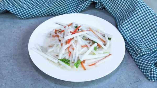 3 裡脊肉切絲加入鹽,糖,料酒,胡椒粉,淀粉拌均勻醃制備用。