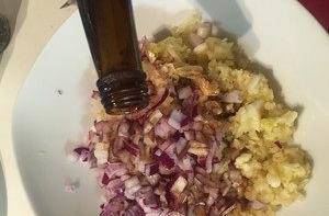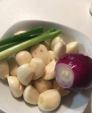 將蒜泥碎和洋蔥碎倒入適量“美極鮮”醬油拌勻靜放5分鐘。