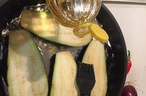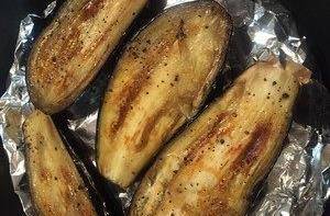 將新鮮茄子切半,正反刷上色拉油,並灑適量鹽和胡椒碎。