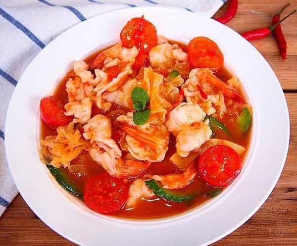 4.鍋裡放一點點油放入大番茄炒出紅油,加一些番茄醬顏色更好看,加入朝天椒、冬筍一起翻炒,翻炒一會後加入高湯(水),煮開後放入蝦和黃瓜片,加糖、鹽調味。最後出鍋前淋入少許水淀粉,讓湯汁更收縮。