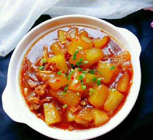 1、食材準備:瘦肉洗凈切小丁,將肉丁用生粉、鹽、糖、料酒、五香粉、老抽勾芡一下;冬瓜削皮切薄塊,香蔥洗凈切碎。
