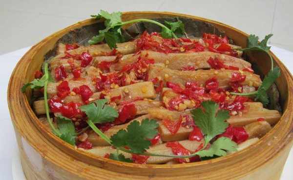 3、等食材全部擺好瞭以後,淋上菜籽油(色拉油沒有那麼香,建議菜籽油)。不用放鹽。因為蠶豆醬就是鹽的。然後上蒸鍋蒸20分鐘,記住下面的水是冷水。