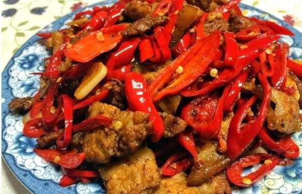 3、再倒入少許油,放入西紅柿塊,加入鹽和糖將西紅柿翻炒出汁水。然後將幹煸好的辣椒放入翻炒均勻,加入醬油和少量熱水燜煮3分鐘入味即可。