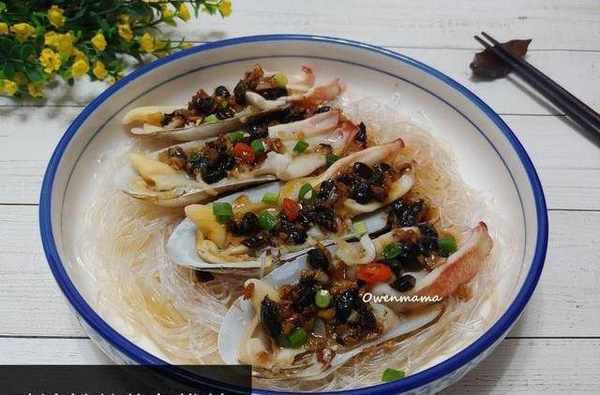 【材料】:鮮活BB象拔蚌4隻、浸軟粉絲少許、辣椒及蔥粒隨意、調味料:蒜蓉2湯匙、豆豉2湯匙、生抽1湯匙、砂糖1/2湯匙、生粉1/2茶