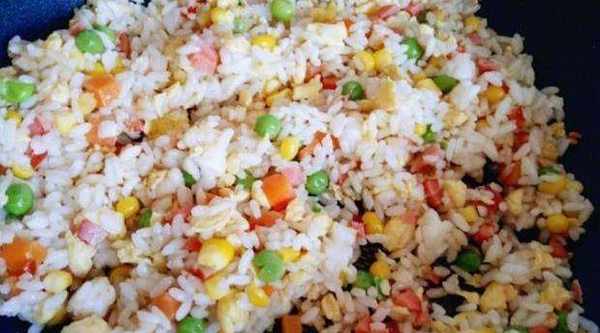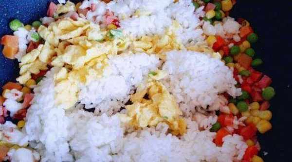 步驟5把熟米飯和雞蛋倒入鍋中。