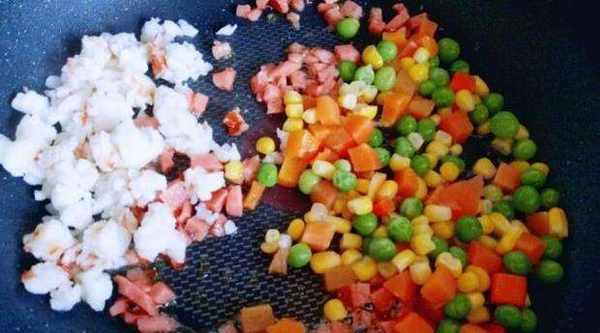 步驟4不粘鍋中加少許油,倒入切好的脆皮腸翻炒,再把紅蝦倒入鍋中,翻炒幾下,加入玉米粒、胡蘿卜丁和豌豆翻炒均勻。