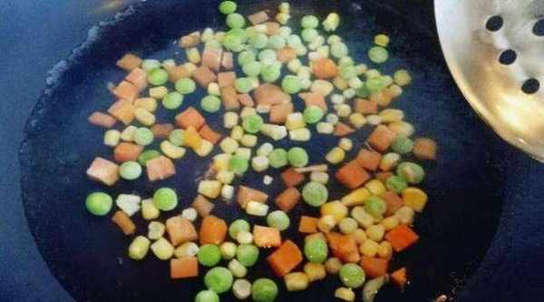 步驟1鍋中燒水,把胡蘿卜、玉米粒和豌豆倒入鍋中,焯水2分鐘撈出備用。