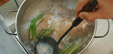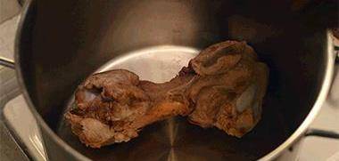 2、鍋中放入一根豬棒骨、蹄髈、豬皮,加1把蔥段、5片薑、半碗料酒和完全沒過食材的清水,大火煮30分鐘,期間撇去浮沫。