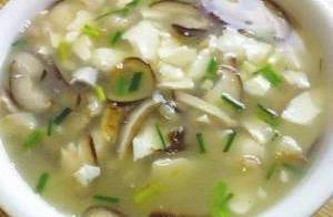 鮮香菇3隻,嫩豆腐200克,精豬肉片50克,蔥花少許,鹽,胡椒粉各適量。