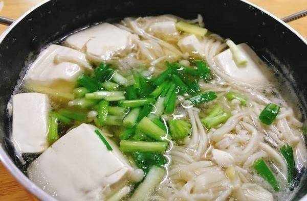 鍋裡加清水,加入薑片,大火煮開後放入豆腐和金針菇即可