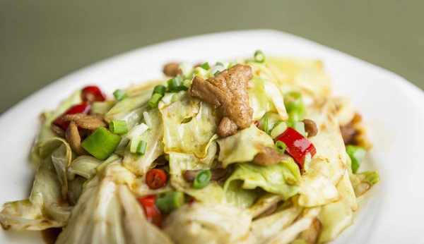 把包菜倒進去,快速翻炒,加一些鹽巴和白砂糖,提味提鮮就可以出鍋瞭。
