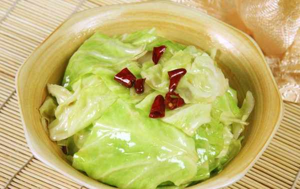 把油鍋燒熱,加入蒜頭和鹽巴抄一下,把包菜倒進去翻炒,出鍋前加一點點的耗油或者是雞精來調味。