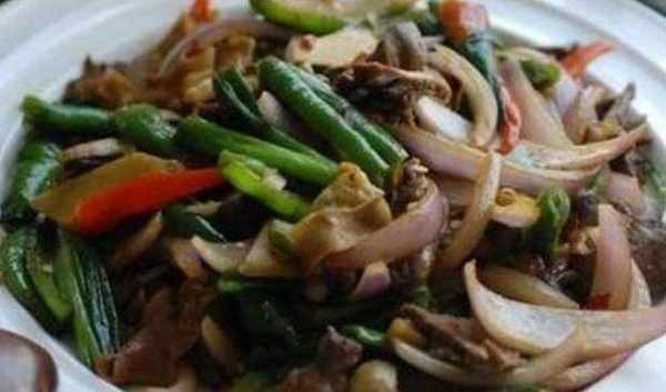 尖椒炒雞雜:1、雞腎去筋,切花刀,雞肝切薄片、雞腸切10厘米左右的段,雞心滾片刀切片。2、青紅椒、洋蔥切件,蒜、薑切小片,蔥切段。3、熱鍋下油,煸炒雞雜,倒出控水。4、熱鍋下油,炒香薑蒜,放入雞胗、辣椒、洋蔥翻。5、加入調味料、洋蔥和蔥綠,最後勾個薄芡即可。
