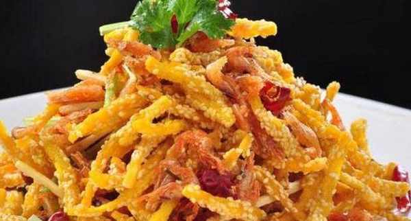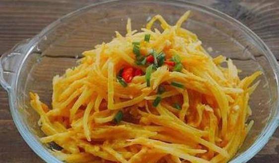 咸蛋黃土豆絲:1、咸蛋搗碎備用2、土豆切絲,如果馬上炒就裝入盤中備用,如果需要等一下炒就用冷水泡著防止變色3、鍋中加入食用油,燒開後倒入碾碎的咸蛋黃翻炒4、直到炒到冒泡泡,倒入土豆絲一起混合翻炒5、撒上蔥花,裝盤