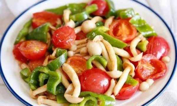番茄白玉菇:1、將白玉菇在清水裡泡著,將青椒洗凈切條備用2、將小番茄洗凈,中間對半切開備用3、鍋裡放水,等水開後,將白玉菇放入鍋中焯3分鐘後撈起瀝幹備用4、熱鍋熱油,將白玉菇放入鍋中翻炒,倒入少量醬油上色調味,然後將小番茄倒入翻炒5、等小番茄炒出汁後,將青椒放入炒至斷生,最後放鹽調味,盛盤