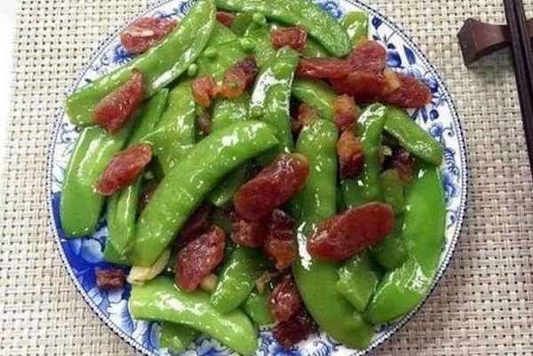 臘味炒荷蘭豆:臘肉切小塊和臘腸成條一起蒸軟,切片備用;或者臘肉臘腸一起用開水汆燙,切片備用。鍋熱少油快速翻炒一下切好的臘味,加入料酒翻炒片刻鏟起備用,油鍋爆香蒜子,下荷蘭豆翻炒,過青後調入適量鹽,3克糖,將已炒過的臘味倒入快速翻炒至味均勻,裝盤即可。