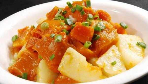 土豆燉南瓜:1、土豆、南瓜去皮,切塊;大豆蛋白用水泡軟後擠幹水分,切塊;青紅椒切段。2、起鍋熱油,爆香薑絲,先放入土豆塊翻炒幾下後,加少許水,蓋上蓋子燜五分鐘左右。3、再放南瓜和大豆蛋白,並加醬油、鹽、咖喱油,翻炒均勻,再次加入適量水,並蓋上蓋子繼續燜至土豆和南瓜都熟透為止,快出鍋前,放青紅椒、蘑菇精,翻炒均勻,待鍋中剩下少許湯汁後,出鍋。