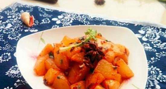 醬燒蘿卜:1.白蘿卜去皮洗凈切塊。2.香蔥洗凈切蔥花.3.起油鍋,放入八角桂皮煸香。4.放入蘿卜煎至表面微黃。5.撒入鹽,倒入蠔油炒勻。6.倒入清水,燜五六分鐘。7.放入老幹媽辣椒醬炒勻。8.淋入生抽炒勻,撒入蔥花,再燒一分鐘,即可出鍋。