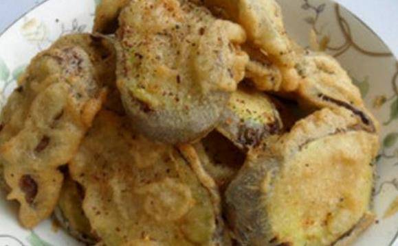 炸茄子:1、長條茄子切成0.5厘米左右的大片,撒上少許鹽醃制10分鐘。2、大碗中放入面粉和淀粉,倒入適量的清水調成面糊;3、把醃好的茄子瀝幹水分撒上五香粉調勻,放入調好的面糊中。4、裹上一層薄薄的面糊,放入燒至7成熱的油中,炸至金黃色時撈出,撒上椒鹽或者蘸蒜泥食用。