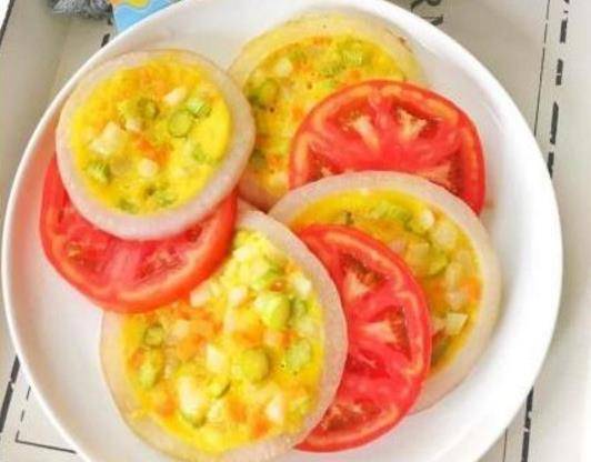 洋蔥圈蛋餅:1、洋蔥橫切成洋蔥圈,將胡蘿卜、蘆筍、洋蔥切成丁;2、將兩個雞蛋打散,加入所有蔬菜丁3、放入適量鹽和淀粉、攪拌均勻4、鍋中抹上少許油,放入洋蔥圈5、用勺子將蛋液倒入洋蔥圈裡,蓋上鍋蓋小火煎熟。