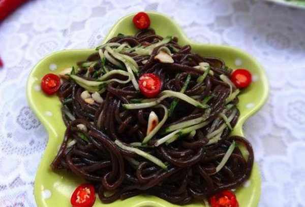 酸辣蕨根粉:1:蕨根粉放到鍋內加水煮至沒有硬芯;2:將煮好的蕨根粉放到涼水中過涼;4:洗凈的黃瓜切絲備用;5:美人椒切圈;6:大蒜切末;7:平底鍋內不放油,將花生米倒入小火烙熟;8:花生晾涼後,用刀摁成碎塊狀;9:將控好水的蕨根粉放到大碗內;10:放黃瓜絲和蒜末;11:拌勻後放入適量的生抽、醋、鹽、糖調味,滴香油提香;12:調勻後將花生末倒入13:倒入紅椒圈;14:盛出享用吧!