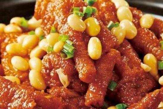 黃豆雞腳:1:黃豆浸泡,蔥白切段,剩下切蔥花,薑切片2:雞腳用開水煮熟後撈出3:鍋內燒熱油,倒入大料和花椒炒香,倒入雞腳翻炒幾下4:倒入提前炒好的糖色快速翻炒至上色均勻5:然後將所有雞腳倒入高壓鍋6:加入和雞腳水平的水,和所有調料7:蓋鍋燉煮30分鐘,高壓鍋放氣釋放壓力,起鍋蓋,將雞腳撈出裝盤8:將高壓鍋裡剩下的湯汁倒入另外幹凈的鍋中,開小火倒入泡好的黃豆。燉15分鐘,湯汁粘稠,黃豆綿軟就可以瞭