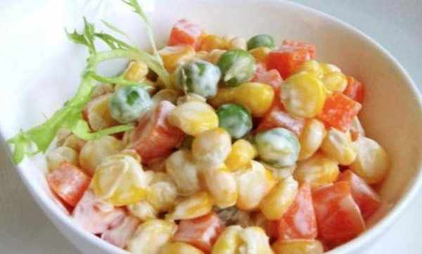 玉米蔬菜沙拉:1. 把青豆、胡蘿卜丁、甜玉米入開水中焯熟過涼開白過涼。2. 撈出食材過涼水控幹多餘水分備用。3. 放入兩勺丘比特沙拉醬,攪拌均勻即可。