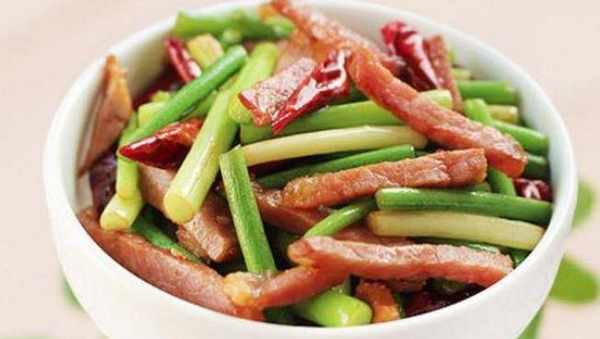 蒜薹炒臘肉:1. 蒜薹摘掉花苞和老筋,洗凈後切3-4厘米的段,臘裡脊肉切成與蒜薹粗細、長短相當的條狀,辣椒剪段。2. 炒鍋上火,鍋熱後加適量油,油溫稍熱就下入臘肉條,小夥煸炒。3. 將肉條煸炒至變色,下入辣椒段炒香。4.倒入蒜薹,改最大火翻炒片刻至蒜薹斷生,加適量的鹽,調味出鍋。