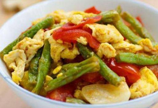 豇豆番茄炒雞蛋:1豇豆切段,西紅柿切塊,蒜切片;2雞蛋打散,調入料酒和水攪拌均勻;鍋燒熱油,倒入雞蛋快速畫圈拌炒,盛出備用;另起鍋,再次加入少許油,油7成熱時,將豇豆倒入翻炒2分鐘;再放入西紅柿炒1分鐘;3放入蒜片,淋入少許清水,蓋上蓋子,用中小火燜3分鐘左右;打開蓋子,淋入少許蠔油;再調入適量鹽;最後將炒好的雞蛋倒入,轉大火迅速翻炒1分鐘,待湯汁略幹即可。