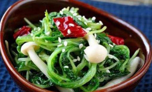 蘿卜苗拌菇:1蘿卜苗和海鮮菇;鍋中水燒開,焯一下。2焯蘿卜苗的水再次燒開,倒入海鮮菇焯水一分鐘左右,撈出沖涼待用;焯好水的蘿卜苗和海鮮菇,放大碗裡,放一小勺鹽、一小勺白糖、一小勺香醋拌勻。3幹辣椒剪成小段,撒在大盆中;鍋中放油,小火加熱,放一小把花椒慢慢炸出香味後,撈出花椒扔掉。把燒熱的油澆在盆中,激發出幹辣椒的香味,最後撒上培香的白芝麻即可裝盤上桌。