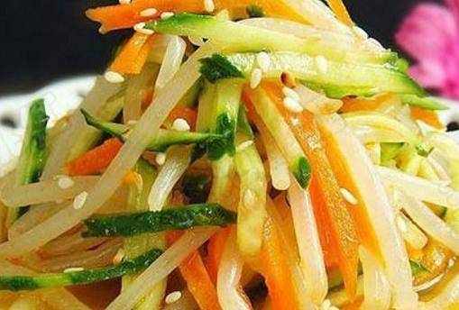涼拌綠豆芽黃瓜胡蘿卜:1胡蘿卜去皮切成絲,黃瓜切成絲 ,綠豆芽摘去頭尾部洗凈備用。2用鍋把水燒開,放入綠豆芽和胡蘿卜絲焯水一分鐘撈起沖涼水,淋幹水分備用。3把綠豆芽、胡蘿卜絲與黃瓜絲拌一起,放入鹽、香油、生抽、米醋、辣椒油攪拌均勻,裝盤後撒白芝麻即可。