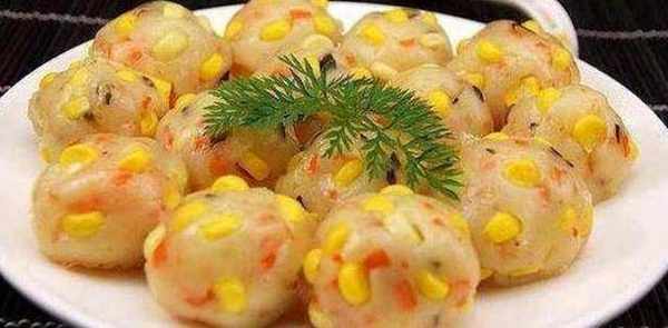 雜蔬丸子:1將芹菜剁成末,胡蘿卜和泡軟的香菇切小丁備用;2土豆蒸熟後,去皮擠壓成泥狀,加入玉米淀粉,少許鹽和糖、雞精,抓捏均勻;3加入胡蘿卜丁、香菇丁、芹菜末拌勻,然後揉成一個個兵乓球大小的團子;4將團子外層粘上玉米粒,均勻擺在盤中,上鍋蒸約15分鐘。五顏六色的丸子做好啦!