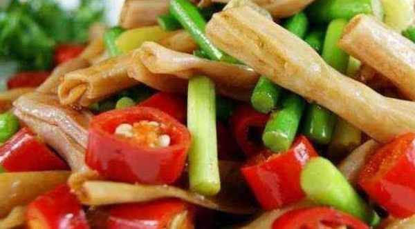 青椒脆腸:1.把肥腸切佛手花刀,黃喉改刀成片,然後投沸水鍋裡汆一水。把香菇改刀成小塊,與土豆粉條一起下到沸水鍋裡汆水。另把鮮青尖椒放入攪拌機,加適量清水打成青椒汁。2.凈鍋放油燒熱,下薑末、蒜末炒香後,倒入青椒汁並加鹽和味精調味,放入土豆粉條、肥腸節、黃喉片和香菇塊稍煮幾分鐘,淋藤椒油和香油便起鍋裝盤。